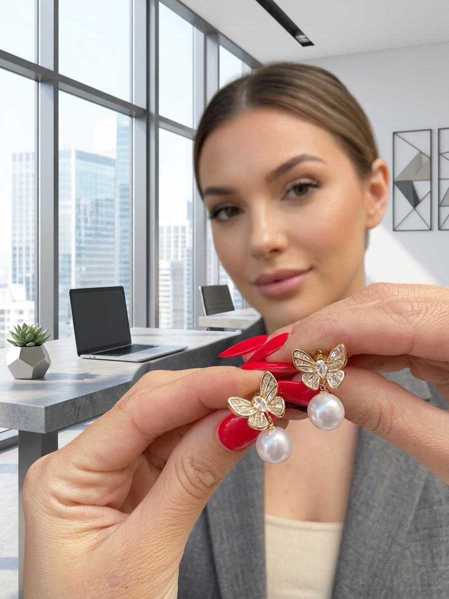 Fe8238 Ατσάλινα λαμπερά σκουλαρίκια πεταλούδες με πέρλα και κρύσταλλα.