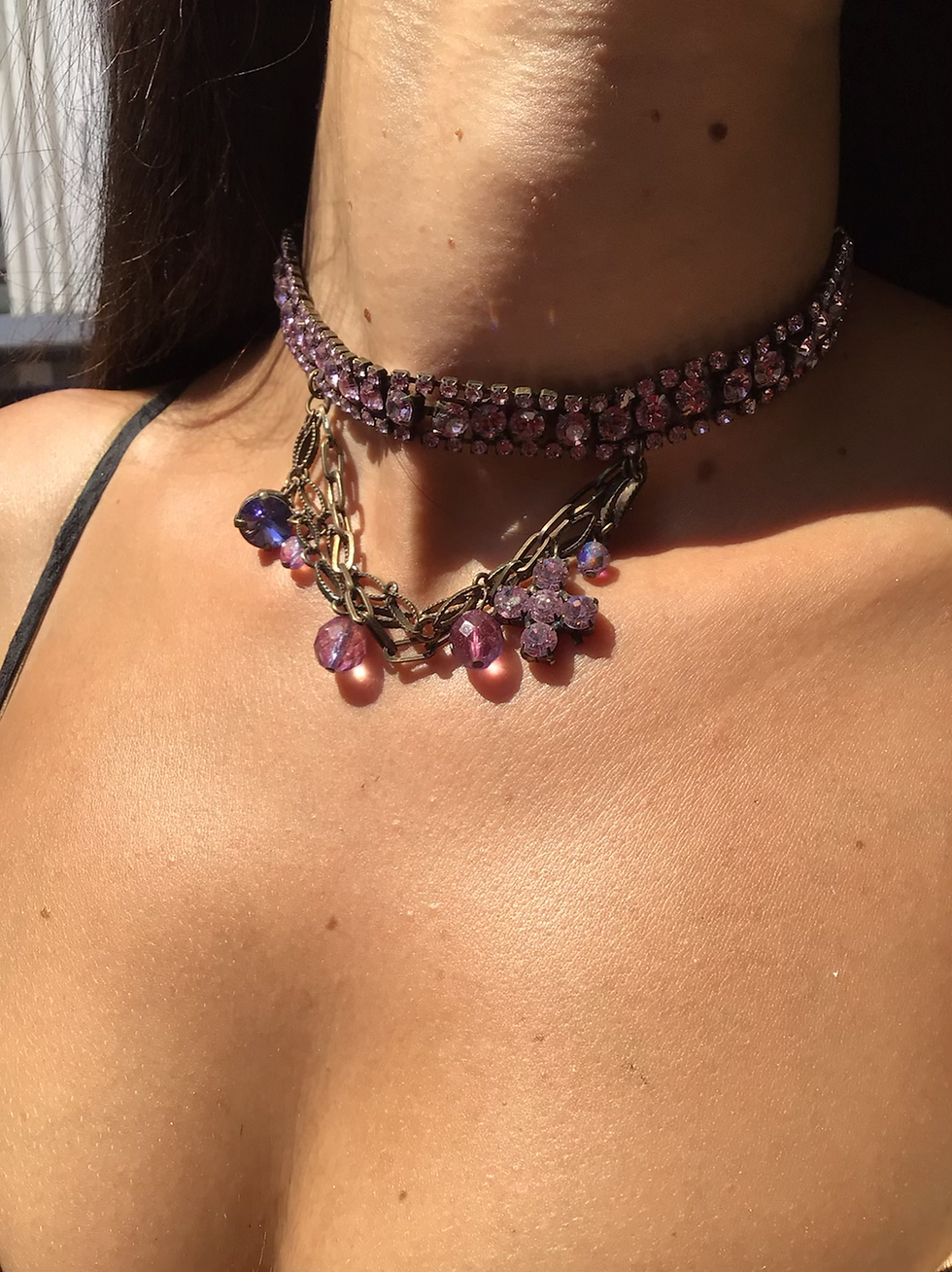 Fn8586 Χειροποίητο κολιέ με αλυσίδες και charms με μωβ κρύσταλλα.